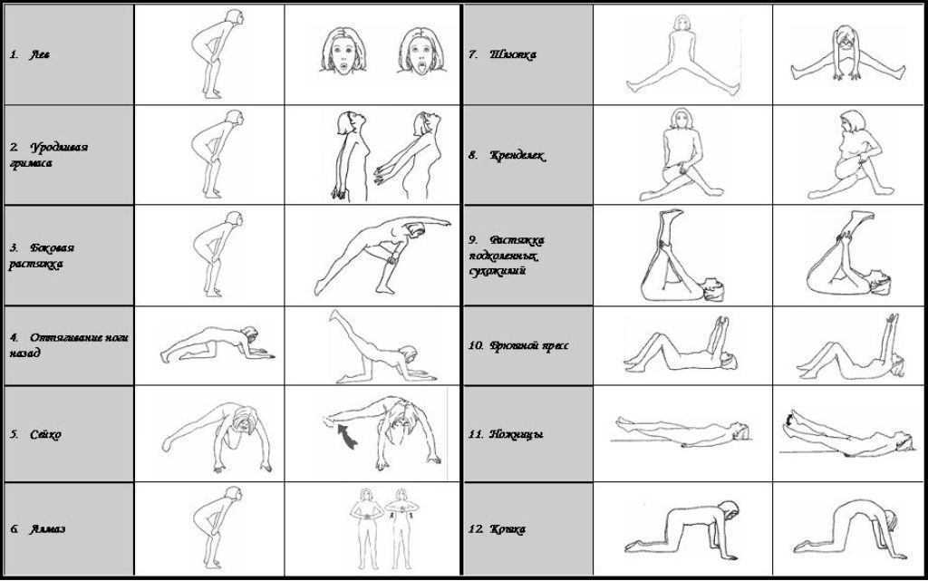 - «Крендель». Сесть на пол, скрестить ноги так, чтобы одно колено находилось над другим. После этого корпус нужно скручивать в сторону бедра верхней ноги. После возвращения в ИП ноги поменять.