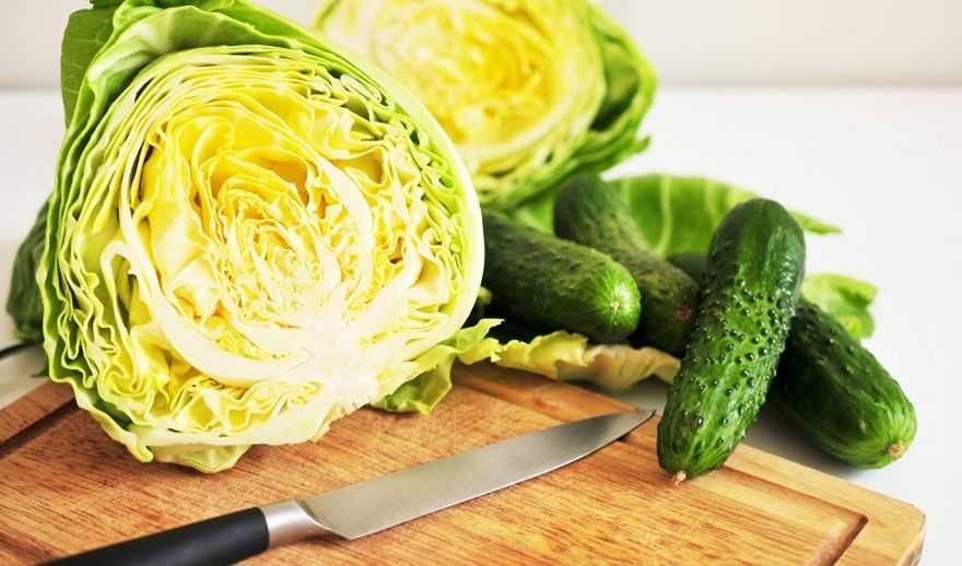 Огурцы и капуста белокочанная или брокколи. Также в равных количествах по 1-1,5 кг. Можно добавить вареное яйцо, морепродукты, рыбу.