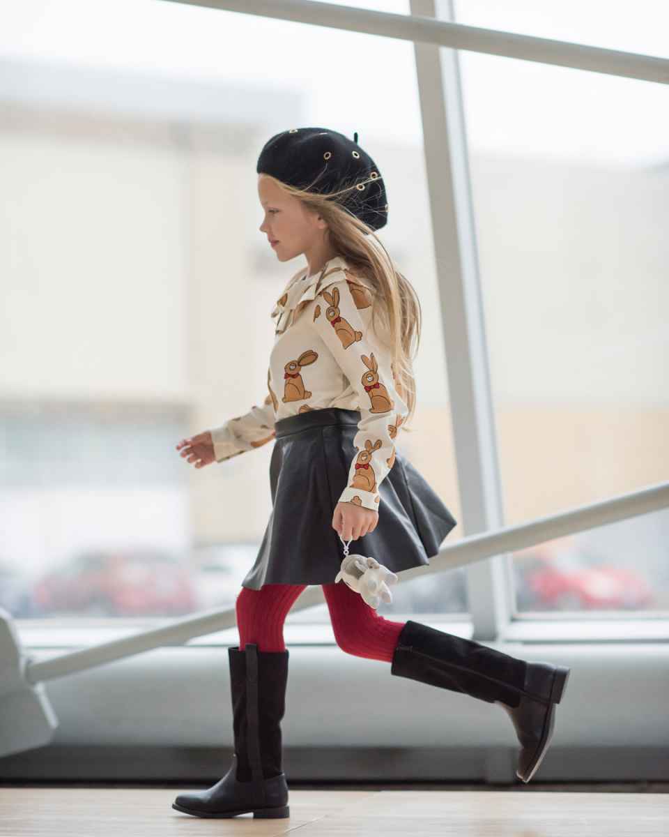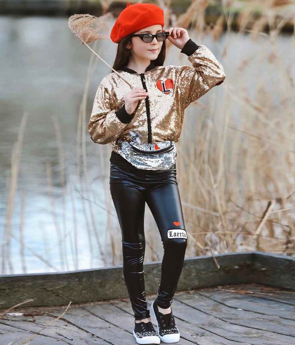 На девочках будут интересно смотреться кожаные брюки, модели классического кроя. Чтобы образ девочки выглядел интереснее, выбирайте модели с модным принтом по низу изделия: анимализм, флористика, полоска или клетка.