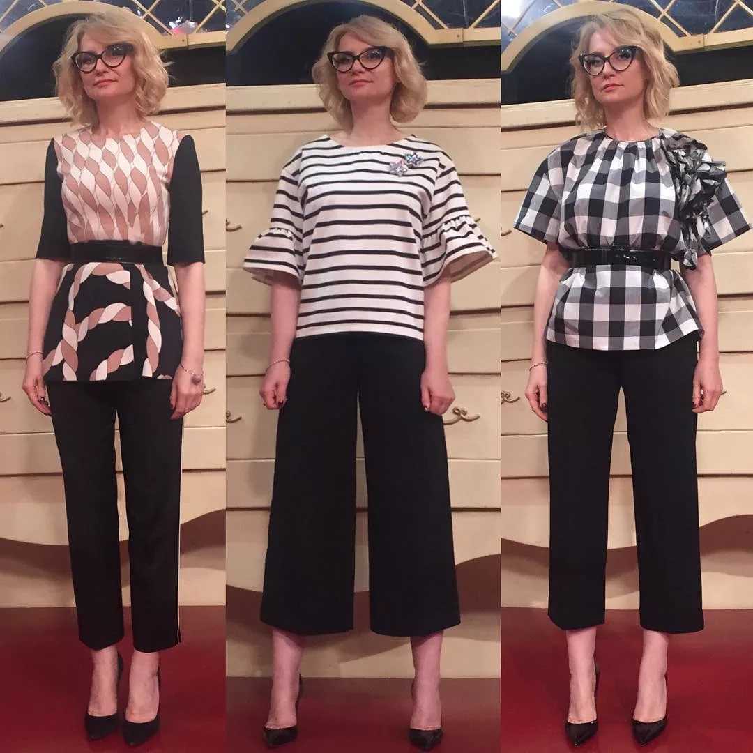 Эвелина Хромченко в повседневной жизни любит комбинировать черные брюки и светлые блузы и пиджаки