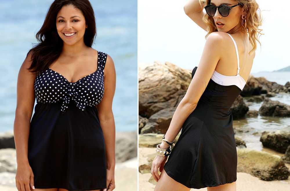 Такой вариант больше напоминает сарафан, чем купальник. Вшитый лиф подчеркнет грудь, а свободное платье скроет недостатки в области живота, боков и бедер.