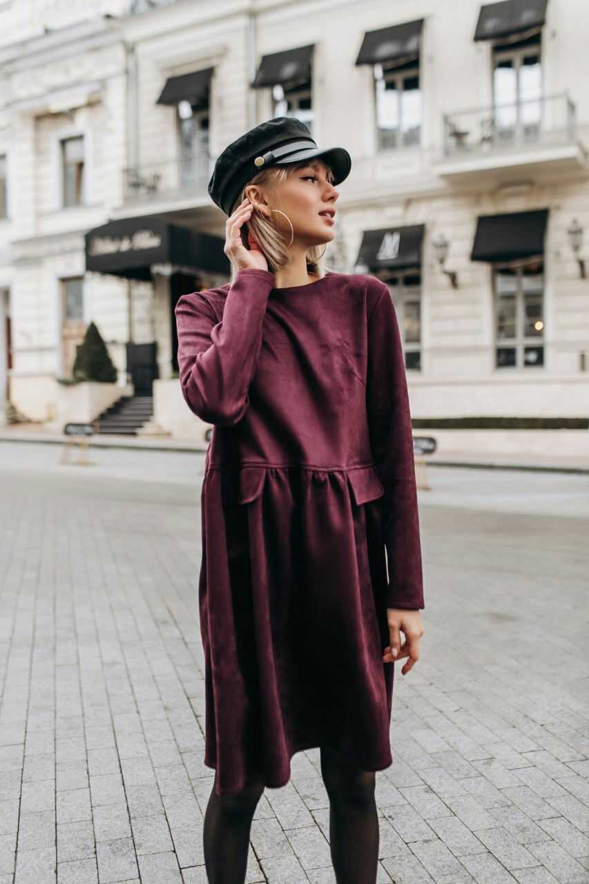 - Замша. Еще один тренд сезона. Наряды отличаются женственным кроем, нежными линиями. Декорируются перфорацией, вставками из прозрачного кружева или кожи. Замшевое женское бордовое платье не требует замысловатых фасонов. Такие модели лаконичны, но смотрятся невероятно стильно и женственно.