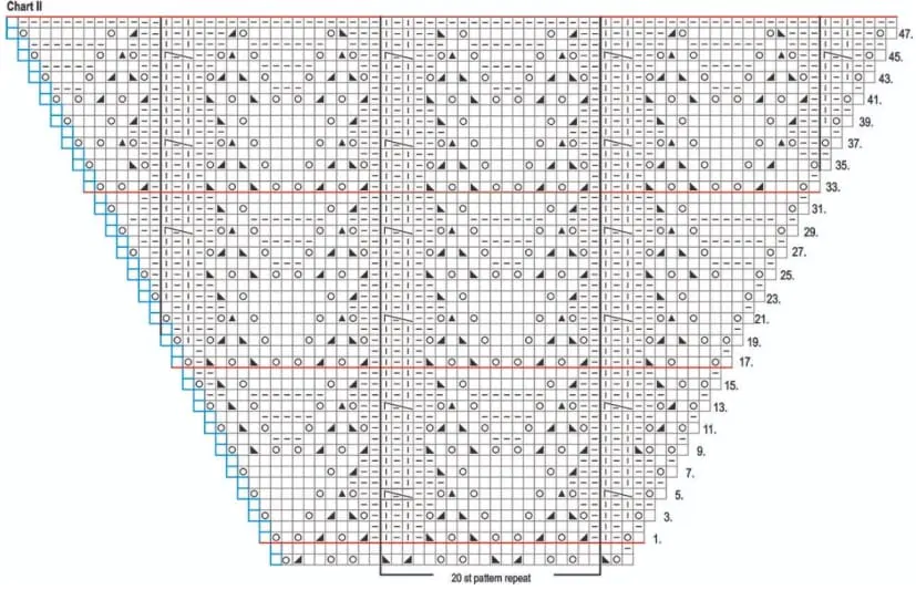 - Затем вяжите по схеме с 13-го по 54-й р. до тех пор, пока на спицах на станет 265 п.