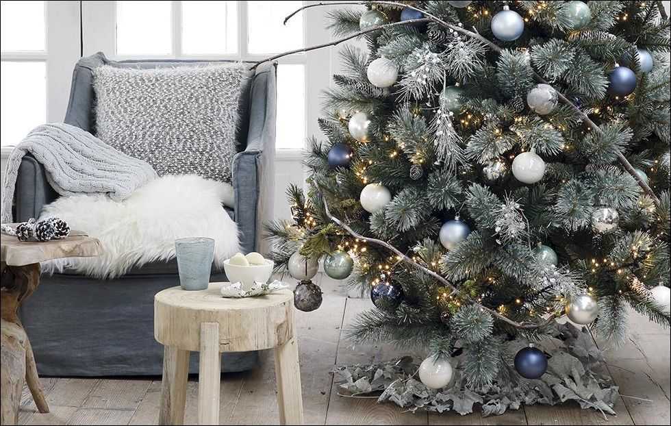 Стиль направлен на подчёркивание красоты самой новогодней красавицы. Цветовая гамма здесь создаётся из двух-трёх оттенков синего. Придётся обойтись без излишнего блеска. Хотя этому стилю и много лет, он совсем не стареет. Однако каждый год требует нового колорита. В этот раз можно внести: