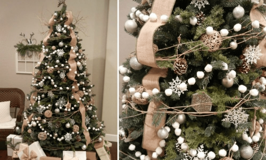 Минимум декоративных элементов, сдержанные тона – в основном белый. Можно добавить бархатные банты, но не загромождайте деревце.