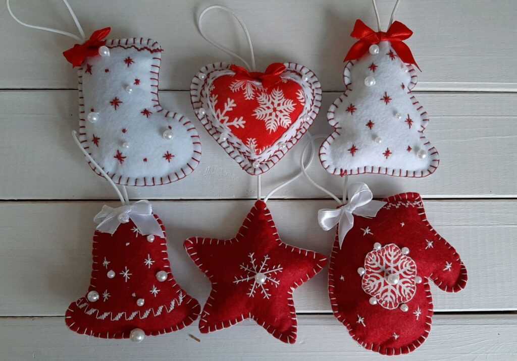 Из тканей получаются очень привлекательные украшения для новогоднего дерева. Вам понадобится швейная машинка и вата, которой наполнять сшитые игрушки. Все очень легко – подготовьте текстиль с новогодним или рождественским орнаментом, вырежьте из него понравившиеся фигурки (звездочки, сердечки, оленей и пр.) сшейте пары одинаковых заготовок и набейте ватой.