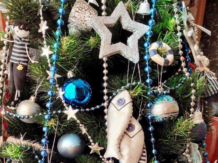 В холодную пору хочется тепла и оказаться где-нибудь на пляже, поэтому удачно будет выглядеть соответствующий наряд елочки – голубые ленты-волны, морские звезды и коньки, ракушки и иные сувениры, привезенные с отдыха.