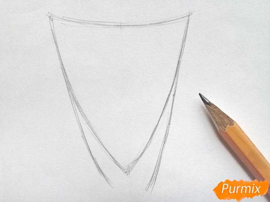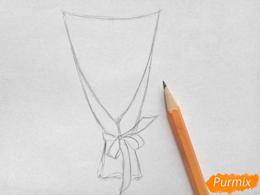 Начнем рисунок с оберточной упаковки, которая будет держать форму всего букета. Её верхняя часть будет самой широкой. К низу боковые части бумаги будут сворачиваться внутрь, поэтому нарисуем дополнительные линии и внизу в центре соединим их.