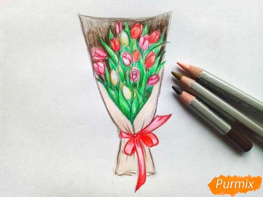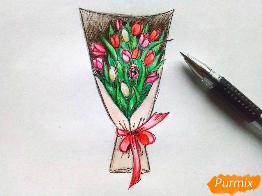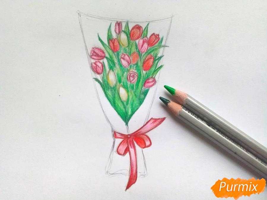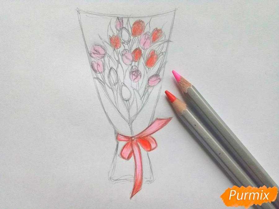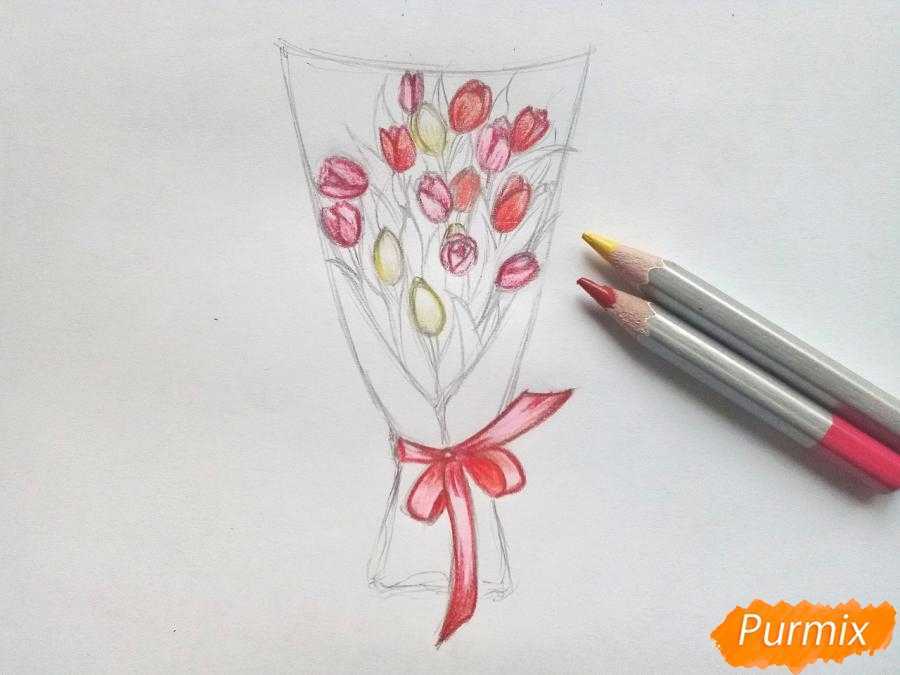 Тюльпаны будут разного цвета. Прорисуем несколько бутонов тюльпанов розовым цветом, а некоторые – красным. Лента на букете будет иметь розовый оттенок, но для объема добавим красный цвет.