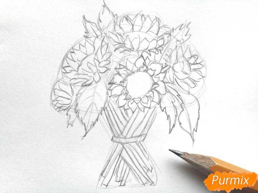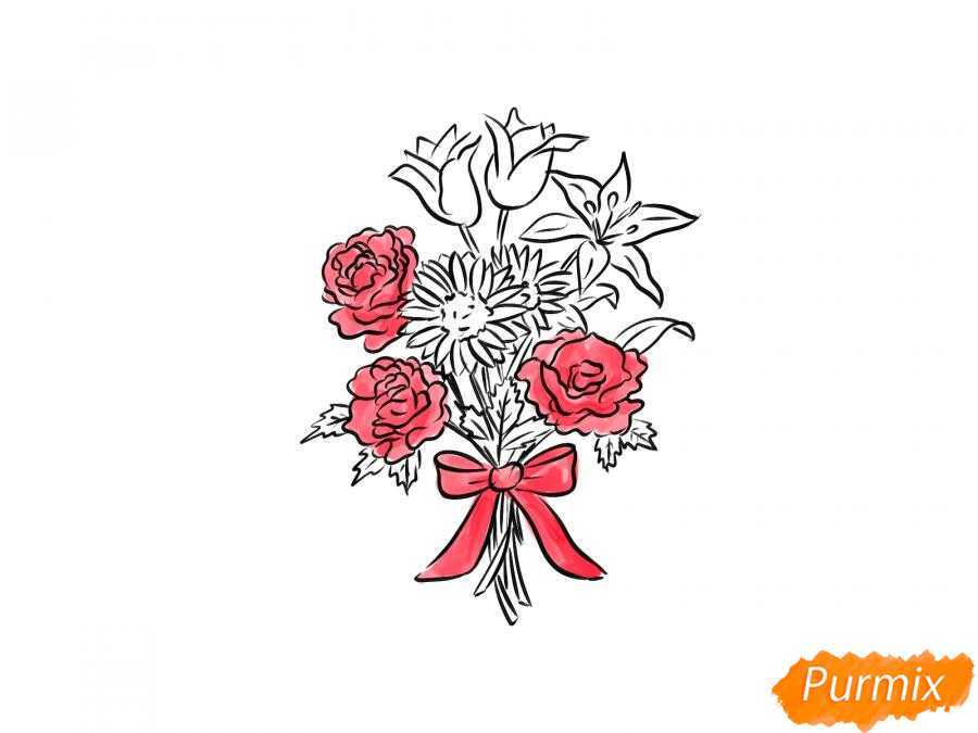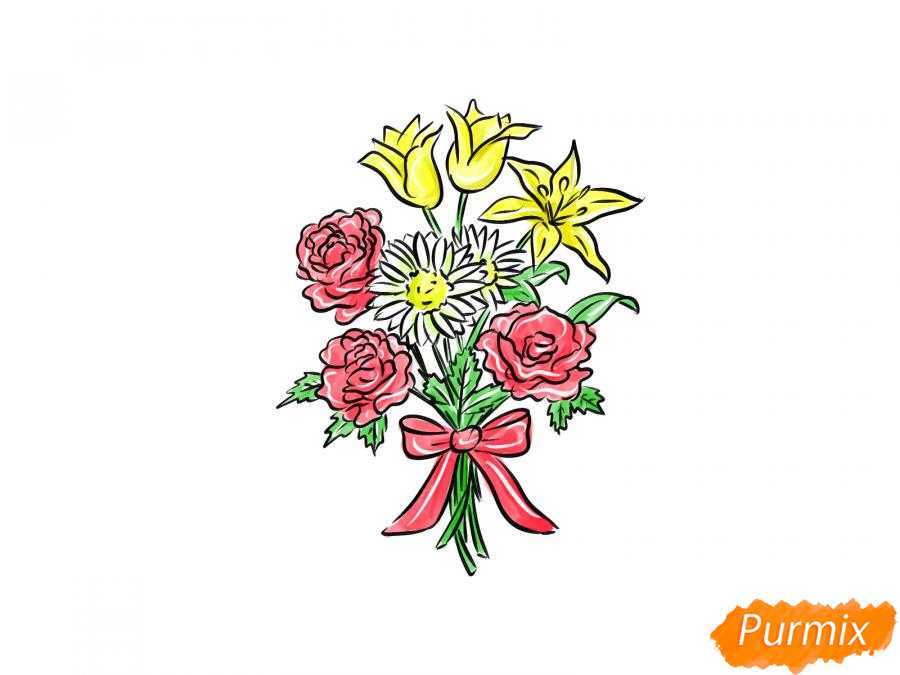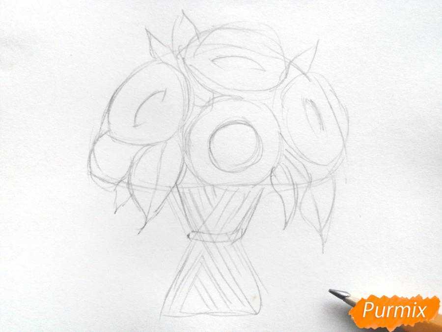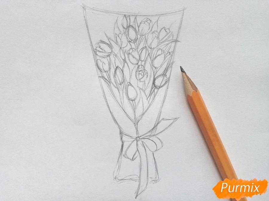 Прорисуем детальнее наш букет – лепестки, листья, прожилки и уточним контуры.
