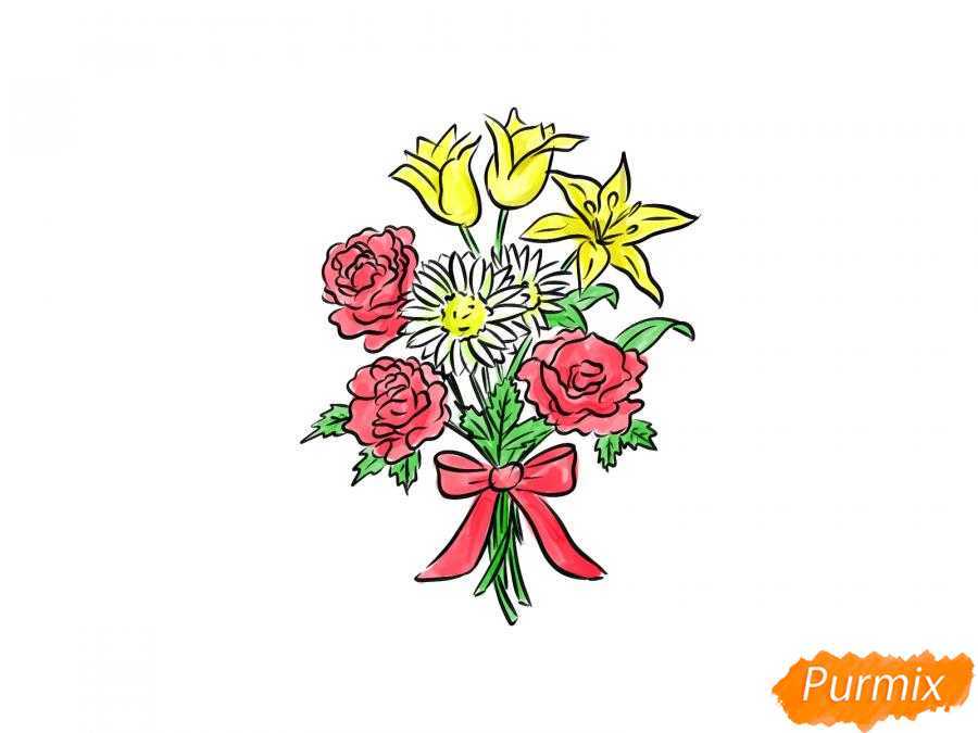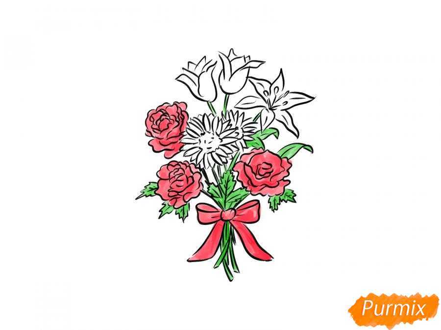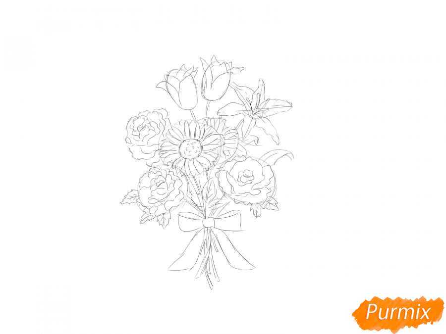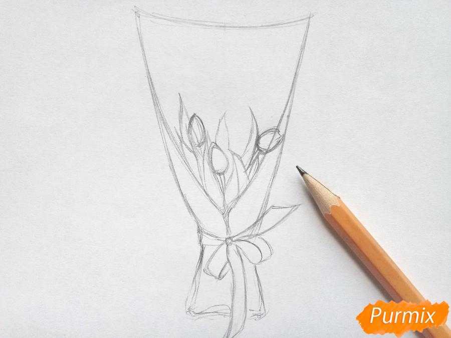 Убираем частично линии построения и добавляем в рисунок листики разных цветков. Они будут отличатся по размеру и форму. Дорисуем стебли и украсим букет красивым бантом.