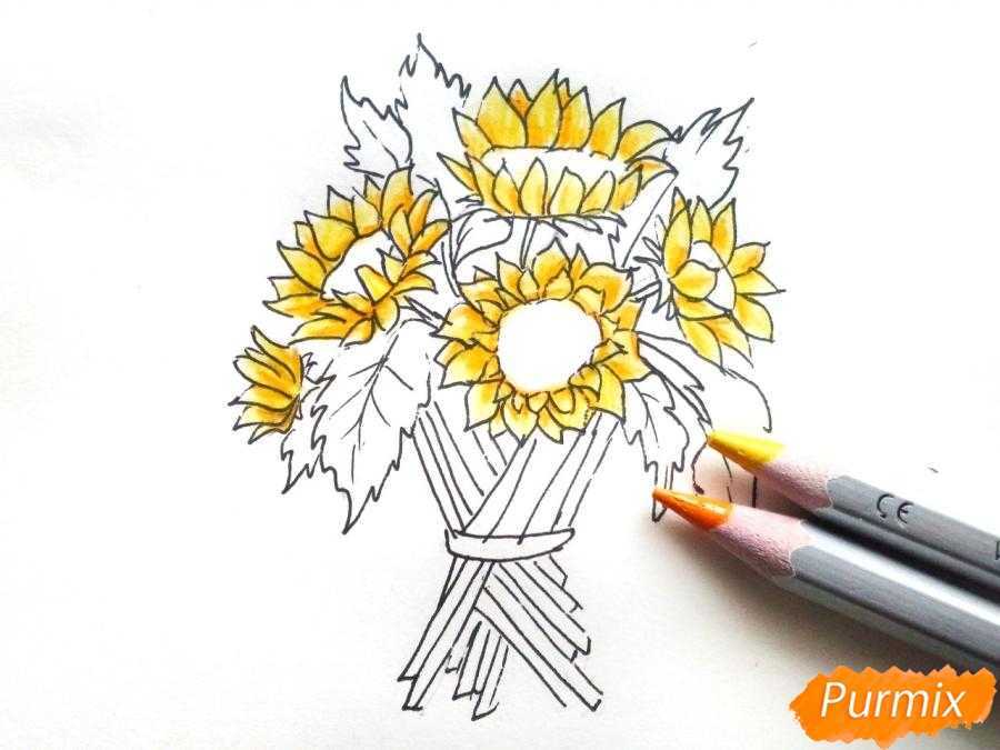 Лепестки цветов прорисуем двумя цветами – желтым и оранжевым.