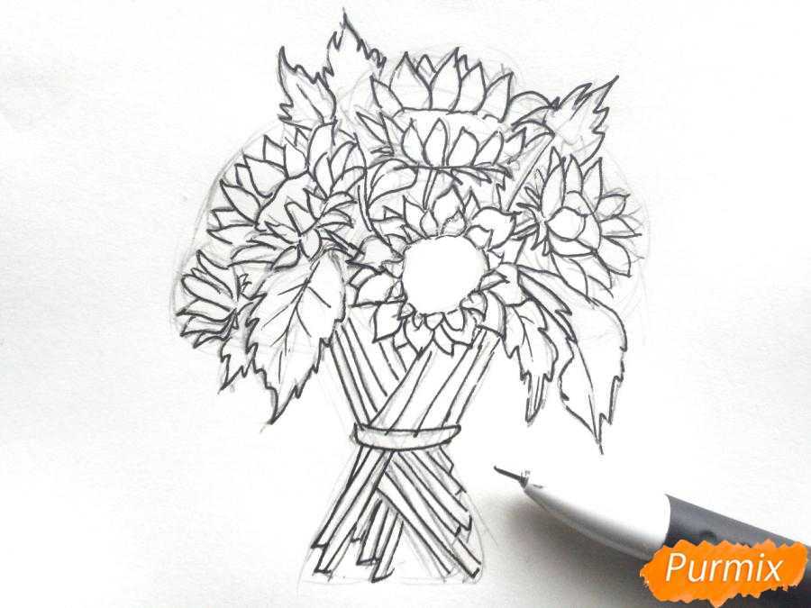 Черной ручкой прорисуем контуры букета и всех его деталей. Можно немного добавить тени с помощью этого инструмента.