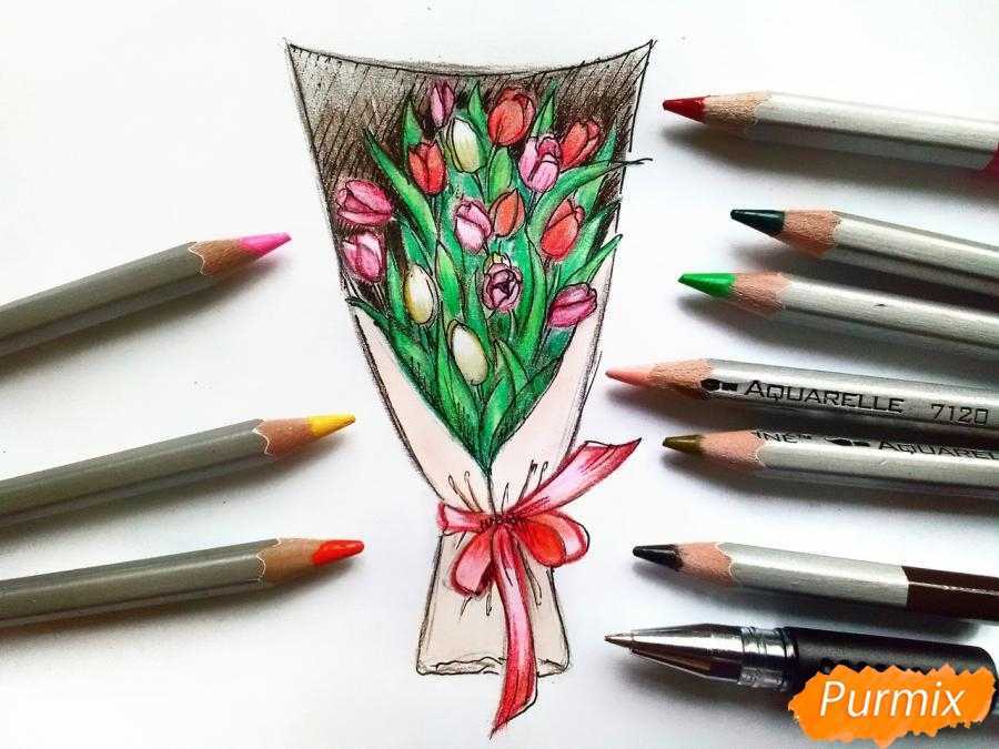 Добавим контраст с помощью черного карандаша. Ленту, которая держит букет, прорисуем голубым карандашом.