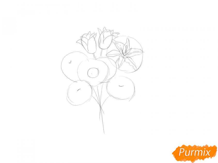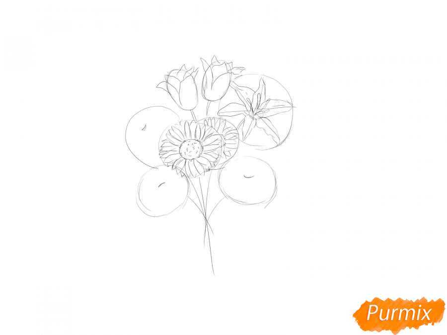 Наметим цветы в букете в виде кружков. Будут они приблизительно одного диаметра. Размещаем их друг возле друга. Соединяем линиями, которые станут стеблями.