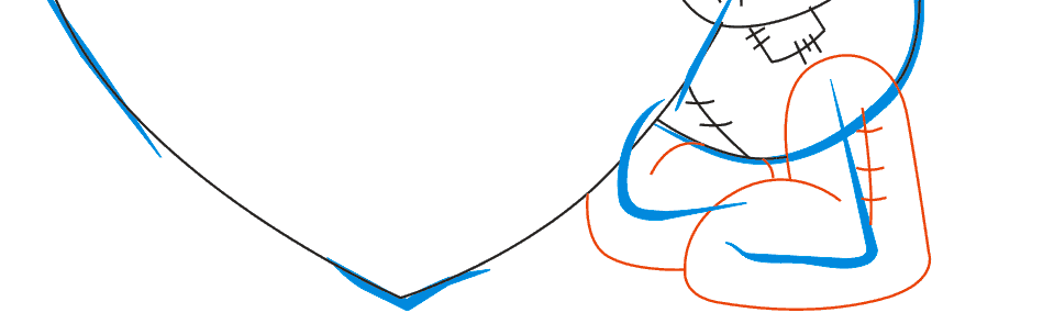 Рисуя его, важно не забывать о нитках, которые могут быть представлены короткими штрихами, проходящими поперек основной линии.. В правой части головы можно нарисовать еще пару швов
