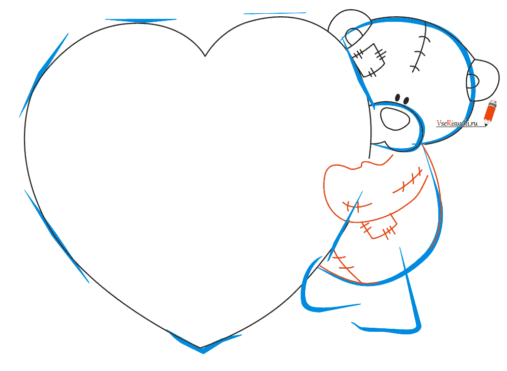 Мишка Тедди карандашом с большим сердцем в лапах следует рисовать в следующие этапы: