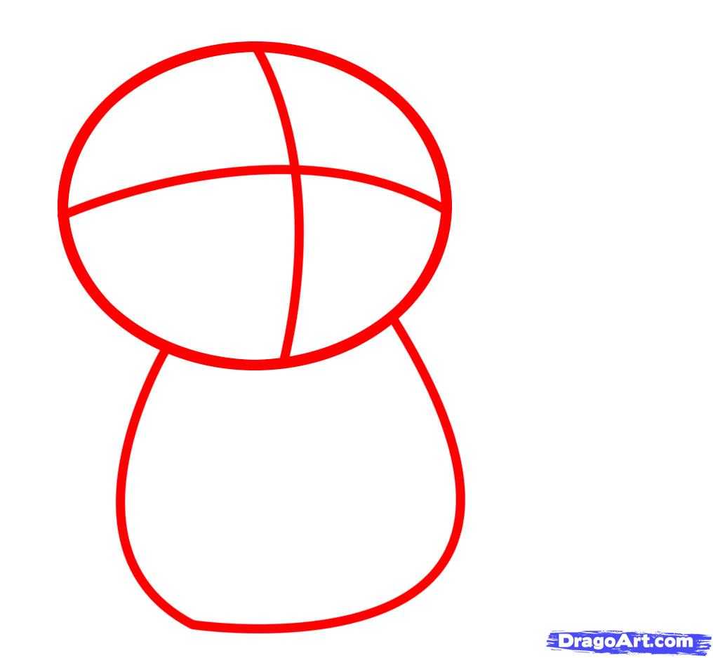 - Вначале чертим карандашом овал. Сразу выводим внизу туловище. Оно похоже на капельку, только без острой верхушки. Внизу изображаем ножки. Выводим тонкие овалы и соединяем их с телом.
