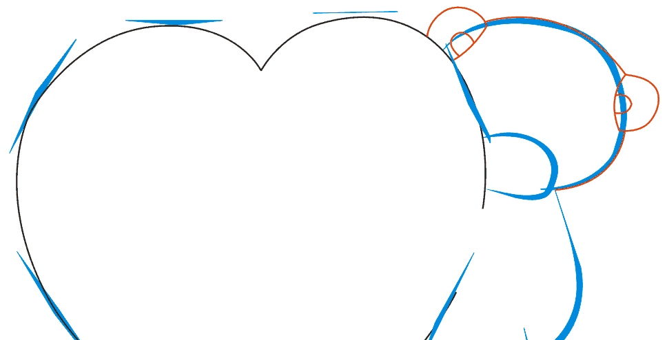 Главная вспомогательная линия для сердца должна проходить чуть правее от головы. По отношению к самому мишки она должна располагаться слева от него. Основная линия будет серединой сердца. Она должна проходить сверху вниз, при этом немного отклоняться влево.