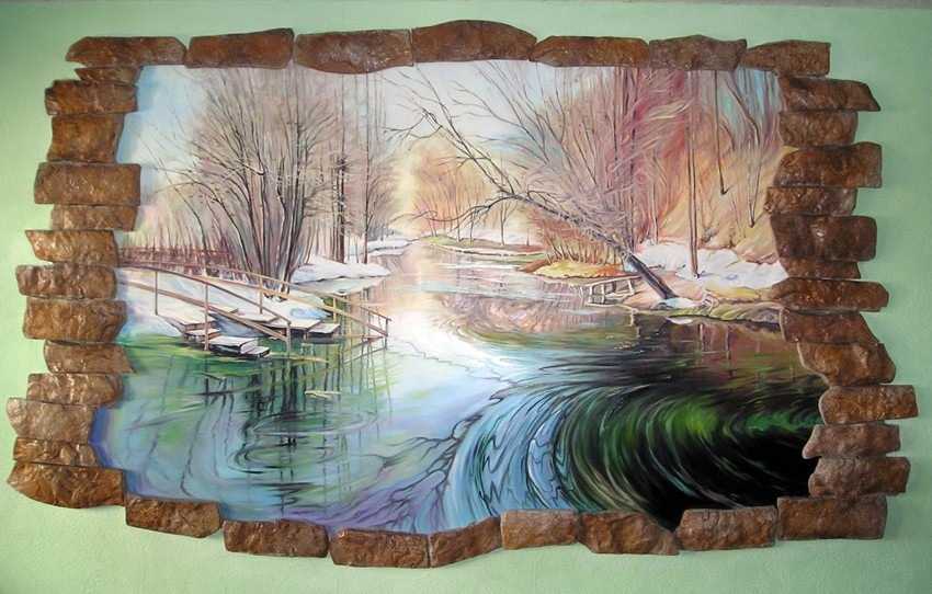 Если делать роспись на стене в гостиной, то здесь нужен особый подход. Ведь данная комната является зоной отдыха для всей семьи, местом, куда вы приглашаете своих друзей и близких. При выборе рисунка, просмотрите панорамные пейзажи, известные произведения искусств, оптические иллюзии.