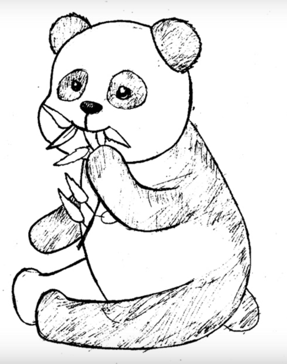 Вот теперь останется лишь заштриховать нужные участи шерсти панды карандашом , и рисунок панды будет полностью закончен. Шерсть у панды довольно длинная и грубая и нужно штрихи делать с «просветом», чтобы создать фактуру грубой шерсти, иначе рисунок панды будет похож на плюшевого мишку. Для большей реалистичности рисунка, можно нарисовать рядом с пандой окружающий ее пейзаж — горы, растительность и конечно же зеленый тростник, с длинными острыми листочками.