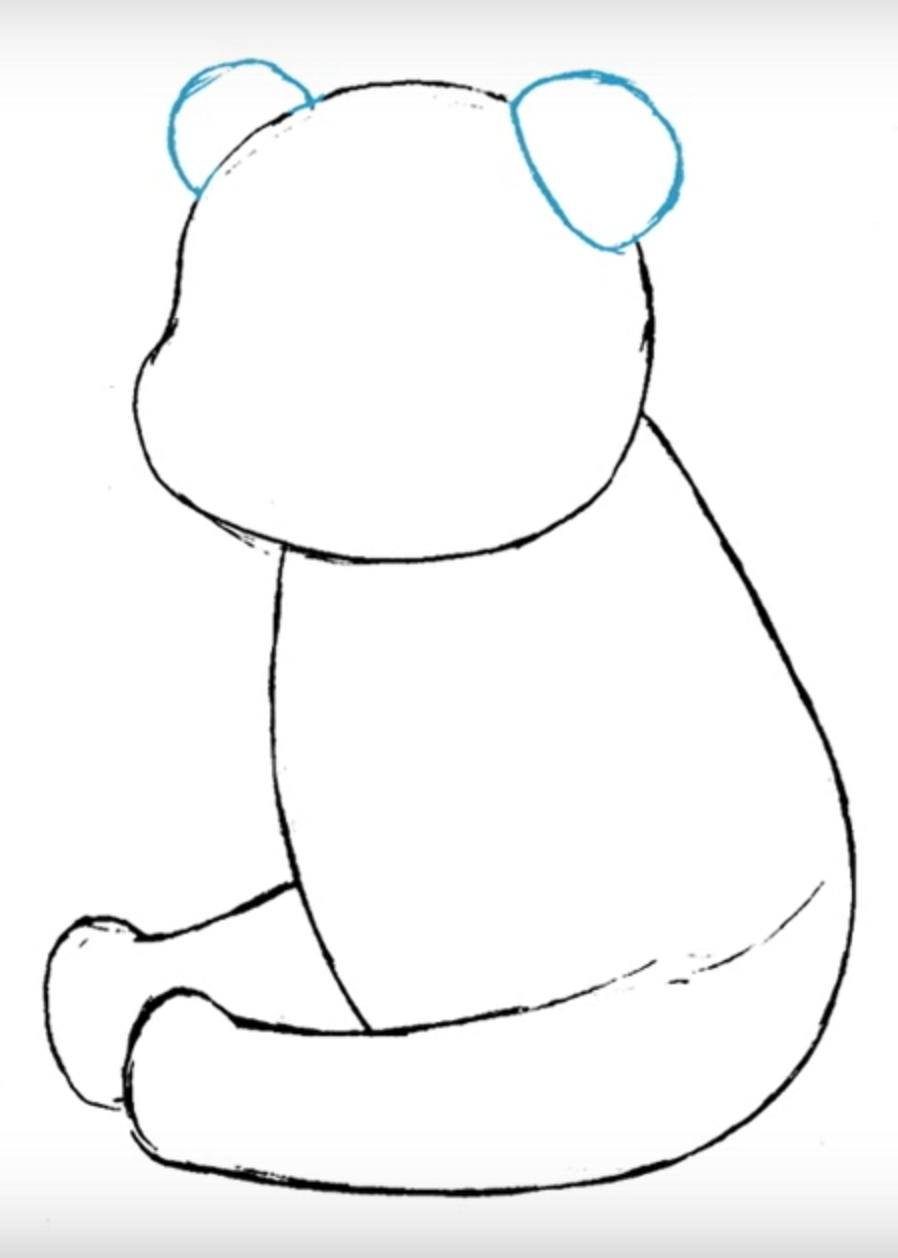 - Прорисовываем голову панды. Рисуем большие уши, которые сильно сужаются ближе к линии головы.
