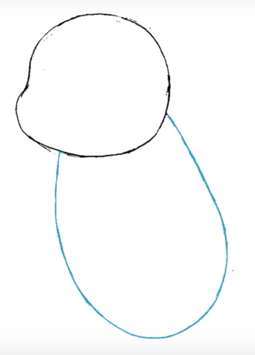 Обрисуйте круглую голову медвежонка с пухленькими щечками. Затем добавьте овальное туловище.