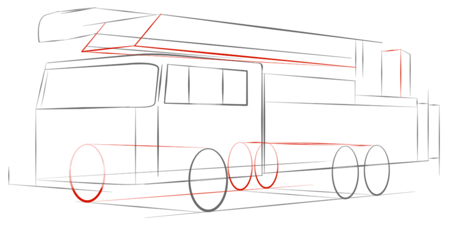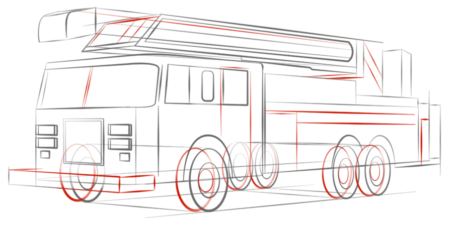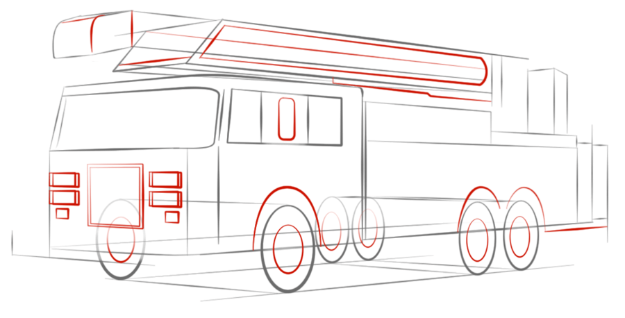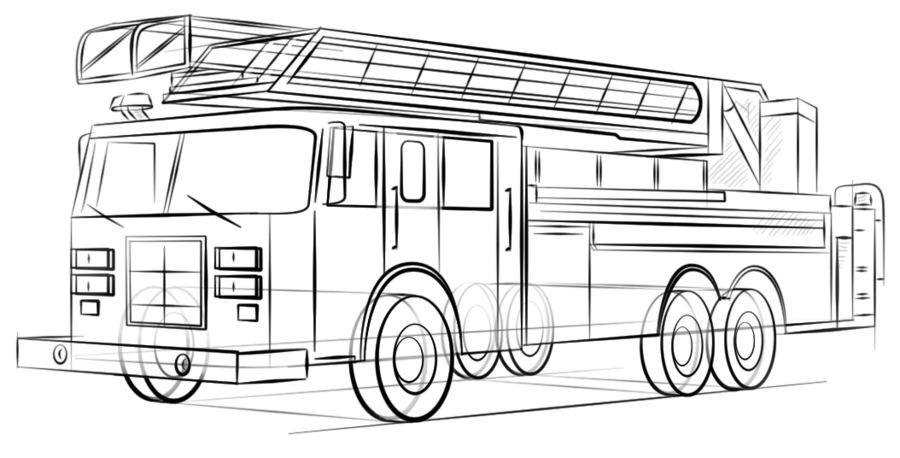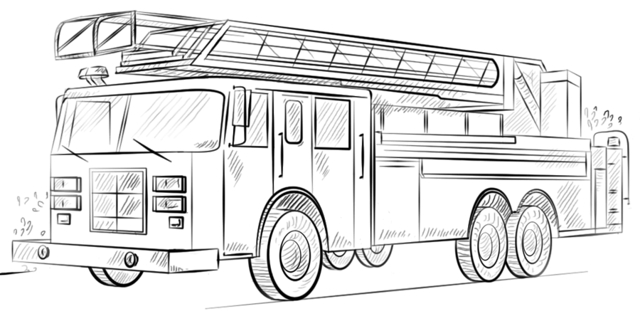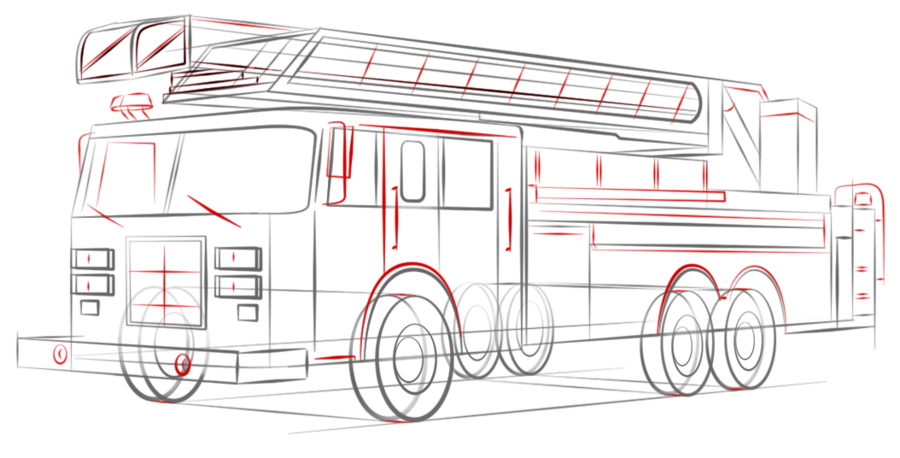 - Рисовать контуры кузова и кабины с окошками и дверями нужно светлым твердым карандашом. Усложнить задачу создания рисунка пожарной машины можно, экспериментируя с положением авто на эскизе. Стоит развернуть его мысленно так, чтобы видно было больше колес (скажем, четыре), которые будут перенесены на бумагу.