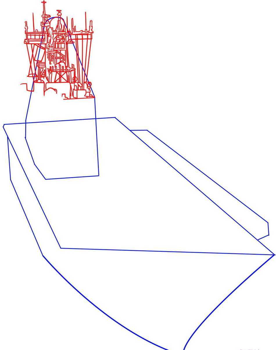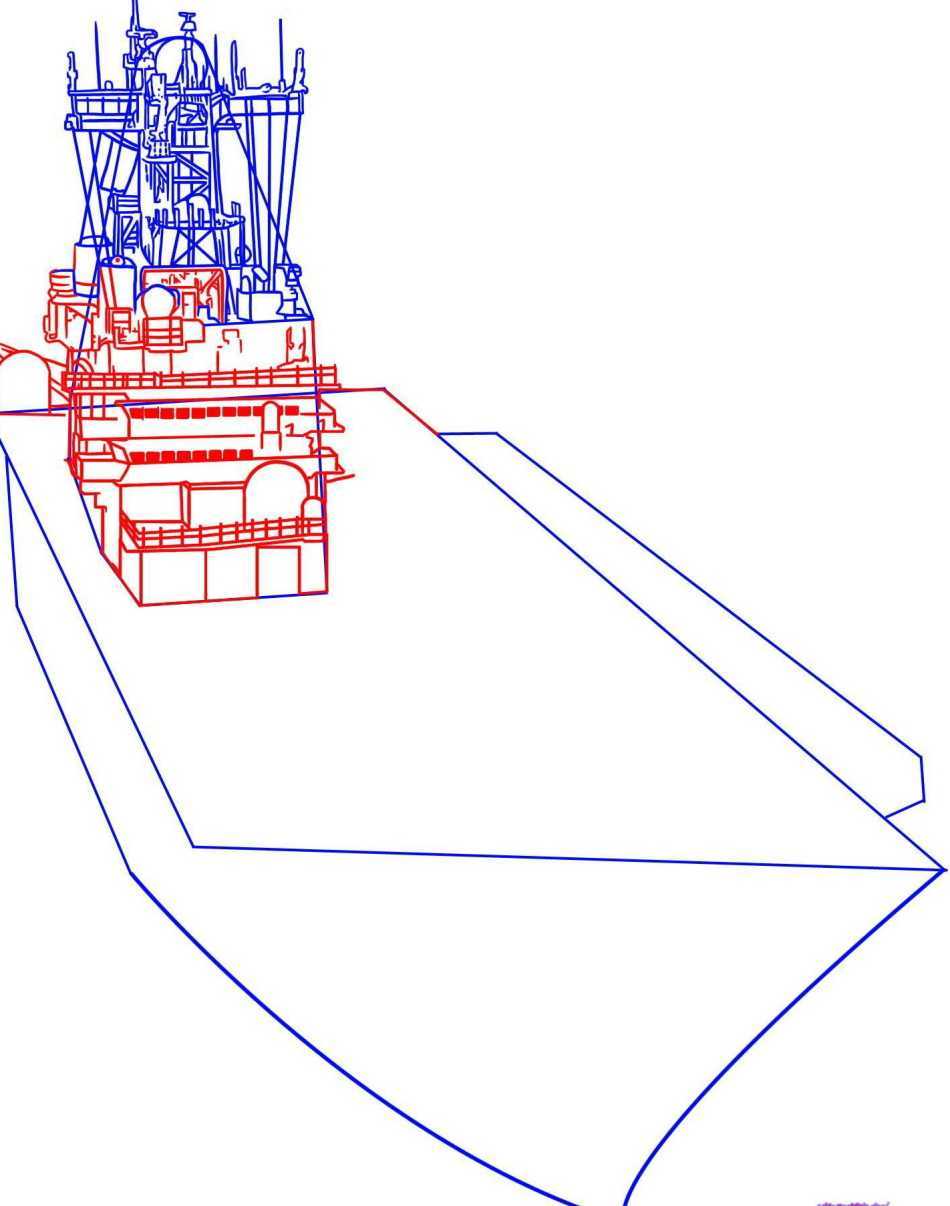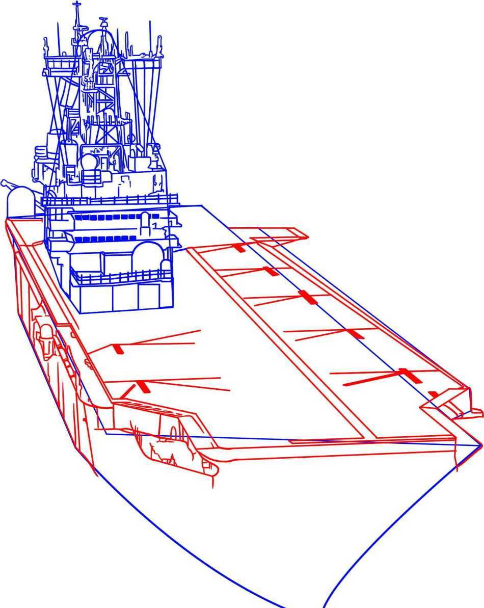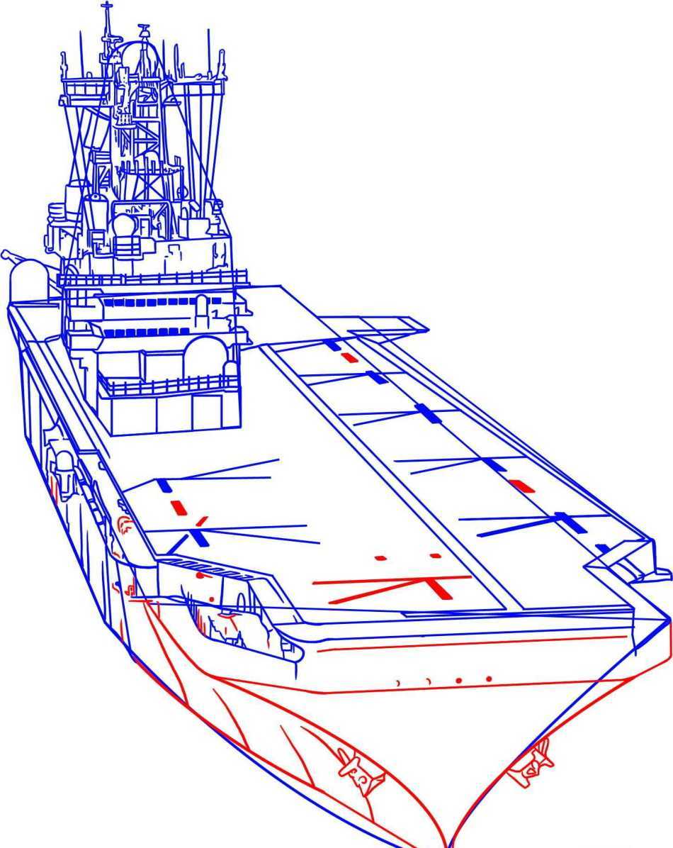 Уделим внимание корпусу корабля, прорисовав все мелкие детали. По обе стороны палубы нарисуем места для стоянки авиационных самолетов