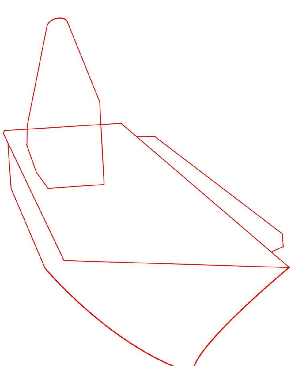 Легкими линиями намечаем корпус корабля. В нижней части корпуса проводим 9 изогнутых линий для обозначения объема корпуса.