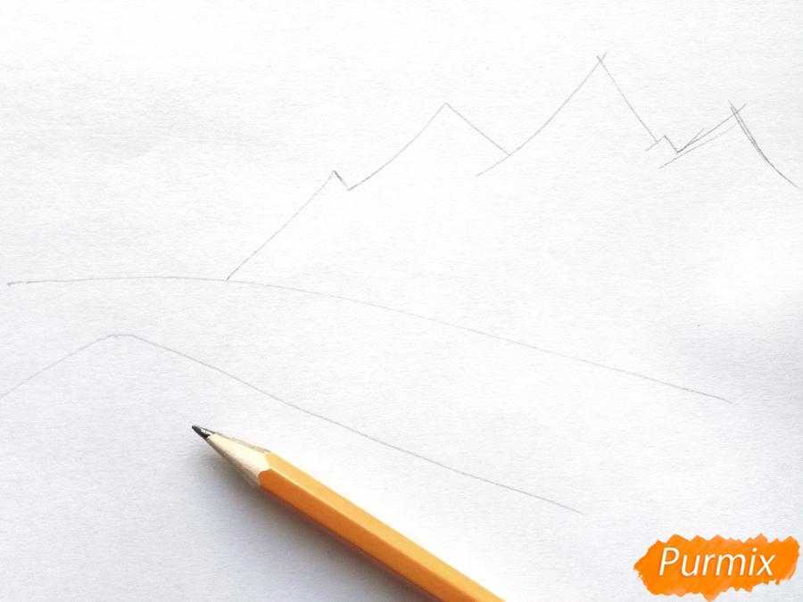 Прорисуем фоновую часть рисунка. На горизонтальной линии рисуем две горы (левая будет больше правой.) А перед ними сделаем силуэты деревьев.