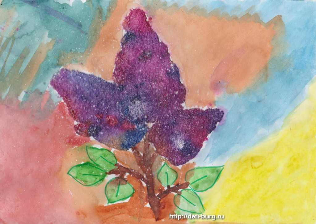 Простым карандашом рисуем контур сирени. Наносим на цветы клей ПВА и насыпаем соль. Лишнюю соль аккуратно стряхиваем. Оставляем сохнуть. Берём акварель и капаем на соль сиреневую, фиолетовую, розовую краску.