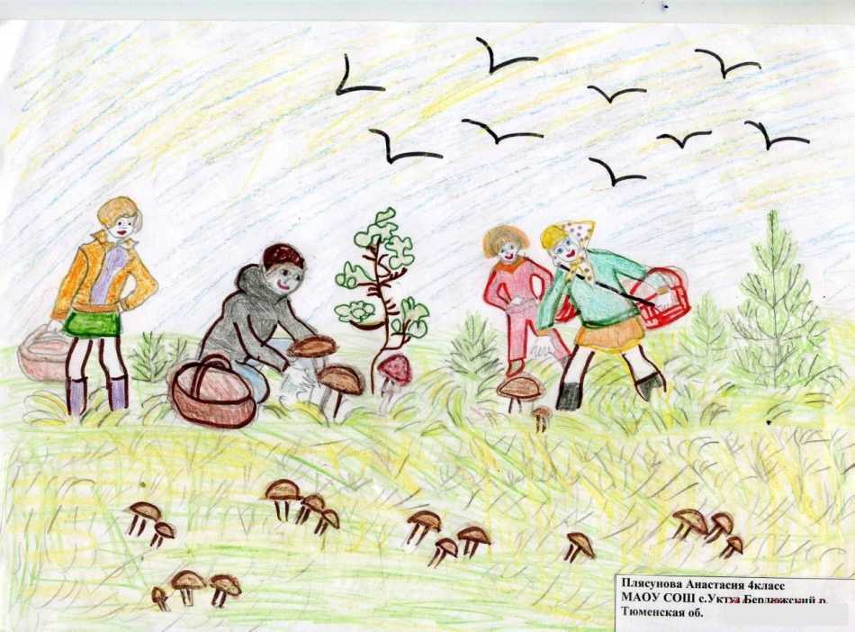 Нарисованные вокруг гриба маленькие подрастающие грибочки. Пожелтевшие листья, трава, веточки придадут рисунку большей привлекательности и реалистичности. Если вы смогли нарисовать гриб красиво и правильно, попробуйте продолжить рисунок и нарисуйте окружающий пейзаж. Можно даже нарисовать , рядом с грибами. Эти животные очень любят собирать грибы, заготавливая их на .