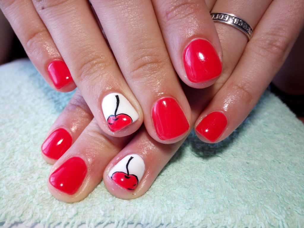 Накрасьте ногти однотонным лаком, один палец выделите лаком контрастного цвета. Именно на нем можно нарисовать маленькую вишенку. Для этого угол ногтя закрасьте красным лаком, придав ему круглую форму, контуры окрасьте черным цветом.