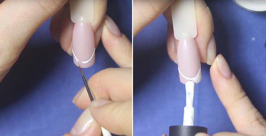 - Прокрасьте верхнюю часть ногтевой пластины, которую вы уже отграничили полоской, белым лаком (это в классическом варианте, вы же можете использовать любой цвет).