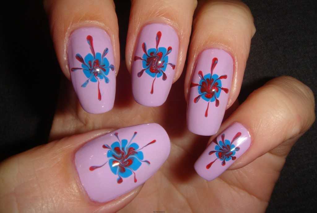 Простой и дерзкий маникюр создается лаками трех или четырех цветов. На основное покрытие нужно нанести разноцветные капельки и затем при помощи зубочистки придать им форму клякс.