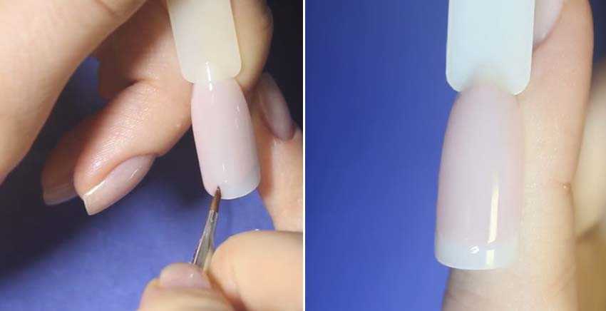 Сначала делается нюдовое покрытие всей ногтевой пластины. Лак должен полностью высохнуть, после чего с ним можно будет работать дальше.