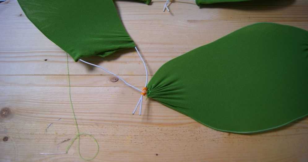 - Ткань. Для пошива наряда подойдут различные по текстуре материалы оттенков зелёного цвета. Лучше, если материал будет приятным для тела и гипоаллергенным. Это может быть трикотаж, флис, велюр, хлопок и другие ткани. Их чаще применяют в костюмах для мальчиков. Юбки и платья для девочек шьют из сатина, атласа или фатина. Для декоративных элементов пригодится фетр. Из него хорошо получаются глазки, реснички и другие мелкие детали.