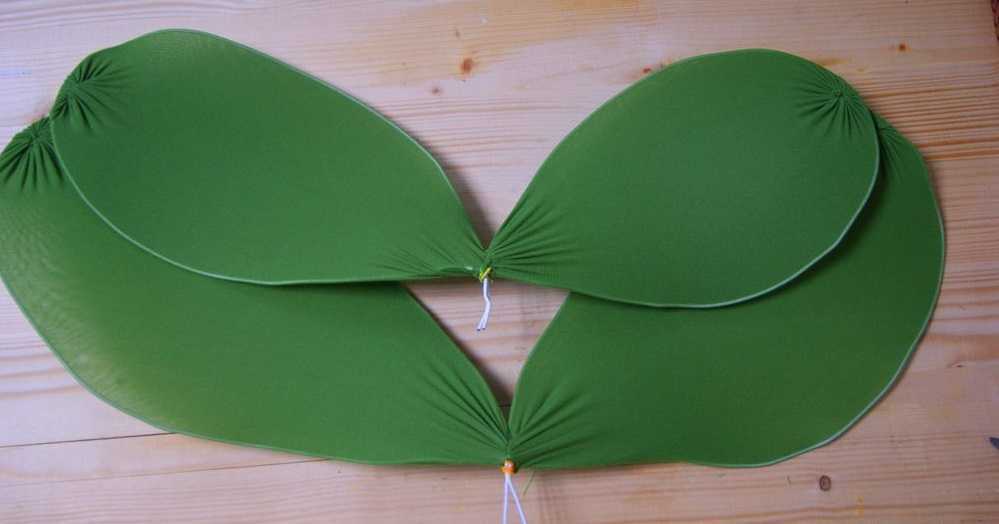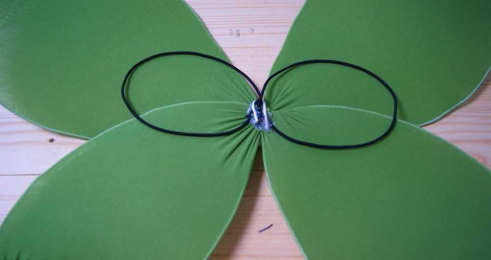 - По обхвату руки ребенка из резинки складывают кольцо, которое пришивают с внутренней стороны по кончикам крылышек. Посередине фиксируют два кольца большего размера, благодаря которым крылья будут крепиться на спине ребенка (наподобие ранца).
