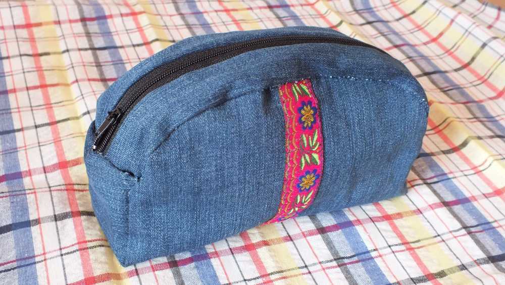 - Для путешествий или повседневной косметики лучше всего выбирать плотные ткани, менее подверженные износу, например, фетр, вельвет, драпировку и т.д. Сумки из старых джинсов или кусочков гобелена прослужат долго.