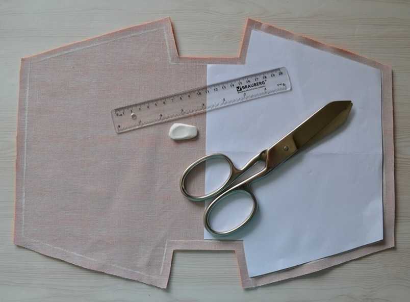 Шаблон стандартно помещается на ткань, которая будет основой изделия. Рекомендуется закреплять ее с помощью булавок или иголок. То же самое стоит проделывать с материалом подкладки. Контуры необходимо обрисовать мелом или карандашом, вырезать, а затем сметать нитками.