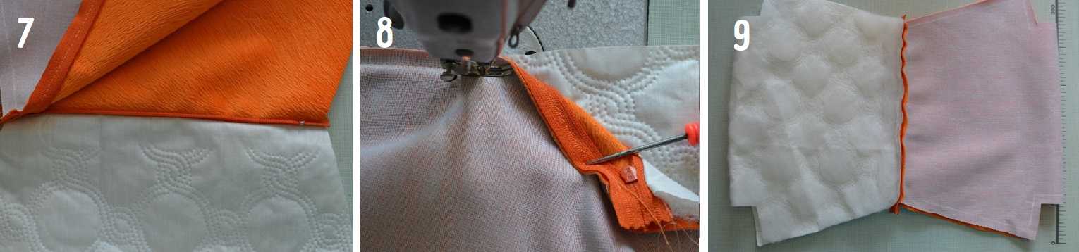 Подкладку лучше пришивать уже после молнии. Таким образом, у вас получается заготовка из нескольких слоев материала.