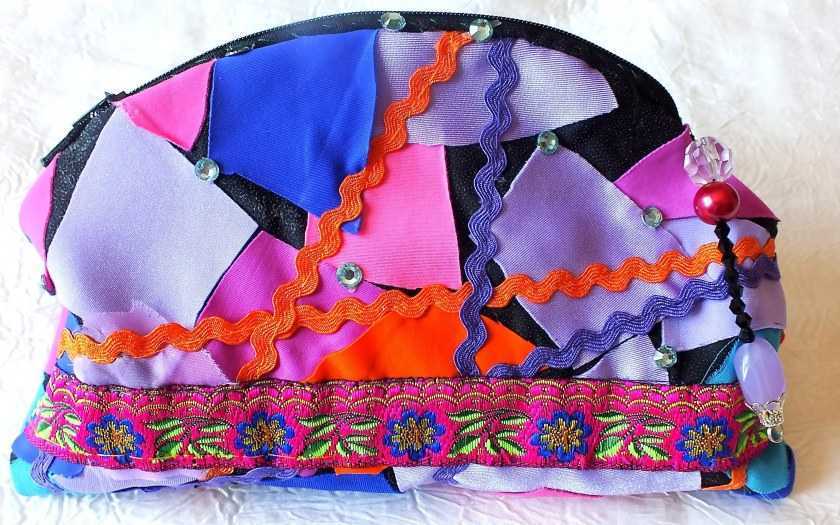 Есть и очень простой вариант пошива сумочки в виде мешочка для косметики. Для этого достаточно иметь кусок красивой ткани, полоску мешковины, тесьму и молнию. Форма этого изделия прямоугольная. Размеры — любые. Главное, чтобы молния имела достаточную длину. Такая косметичка в выкройке на бумаге не нуждается. Крой делается прямо на ткани.