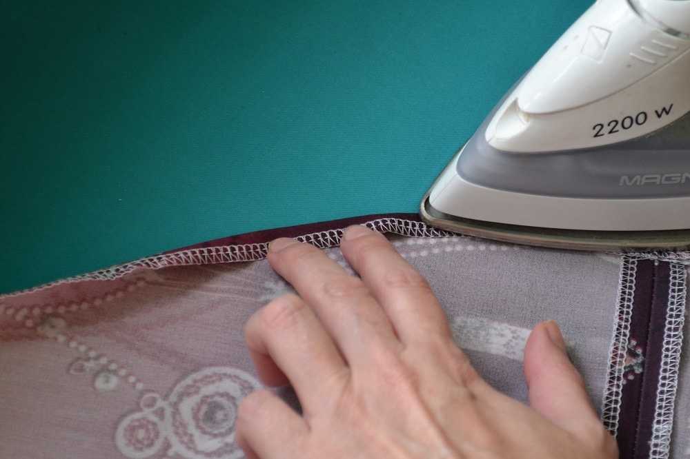 - Подшиваем подол. Для этого нижний край изделия подогните на изнанку на 5 мм и приутюжьте. Загните опять и приметайте.