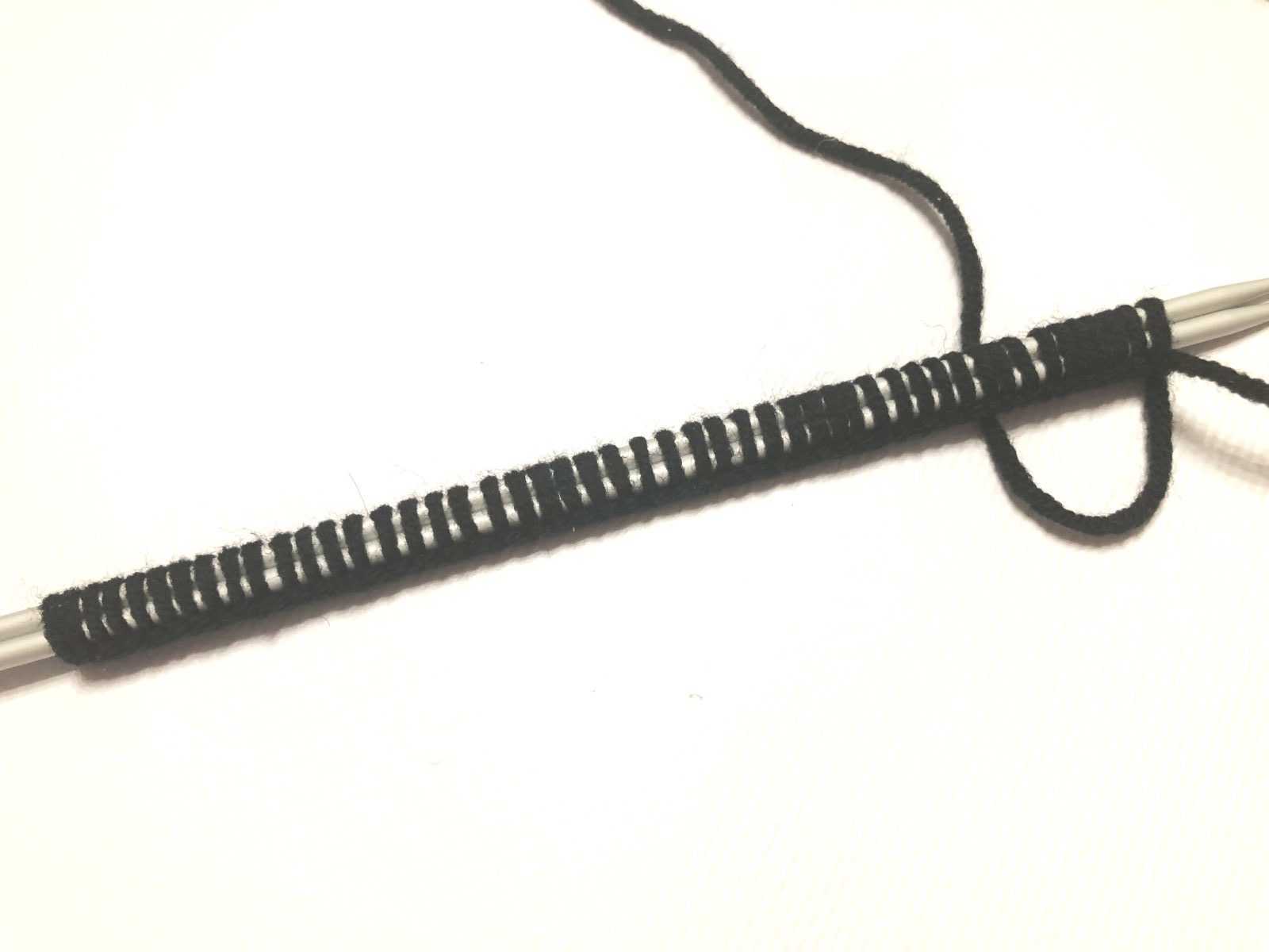 Набираем на две спицы 48 петель и еще одну петлю для того, чтобы вязание скрепилось в круг и не было заметно перехода.