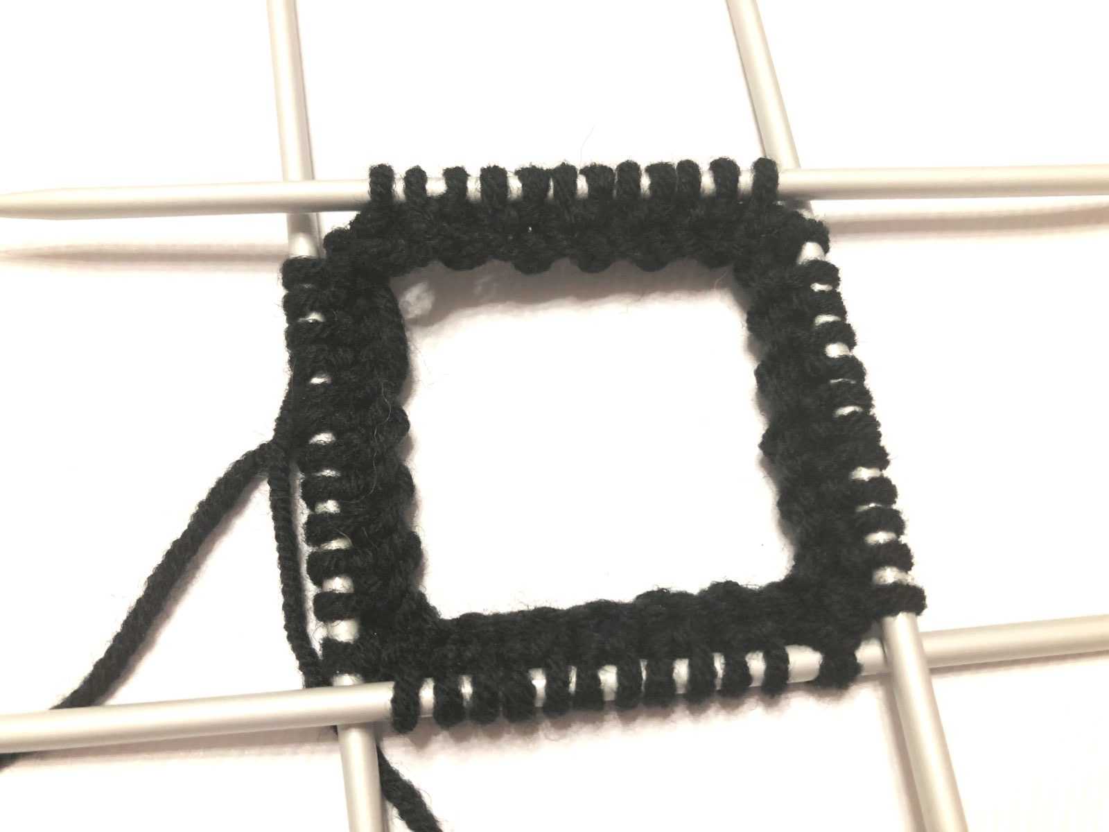 Третий квадрат вяжется аналогично серому, только красной нитью. Четвертый серый соедините с красным. Первый ряд наборный, второй изнаночный, с третьего каждая последняя петля лицевого ряда соединяется способом 2 вместе с кромочной петлей красного квадрата.