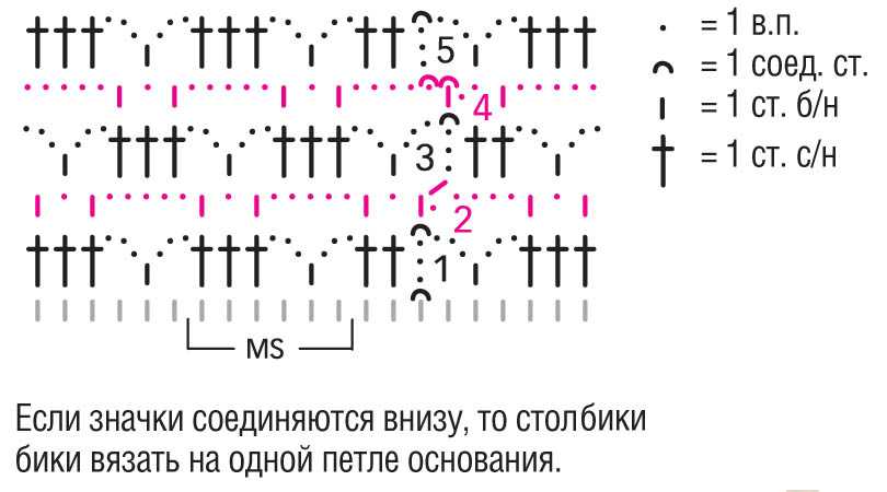 Вязать ст. б/н. Каждый круговой ряд начинать с 1 дополнительной в.п. и заканчивать 1 соед. ст. в 1-й п/ст. Для выполнения ст. б/н нить проводить до ввода крючка перед работой и вводить крючок за рабочей нитью.