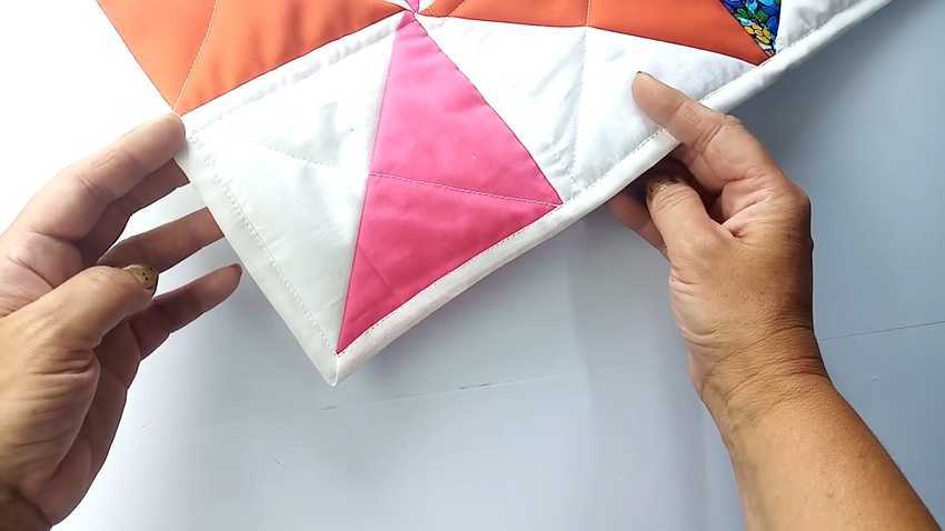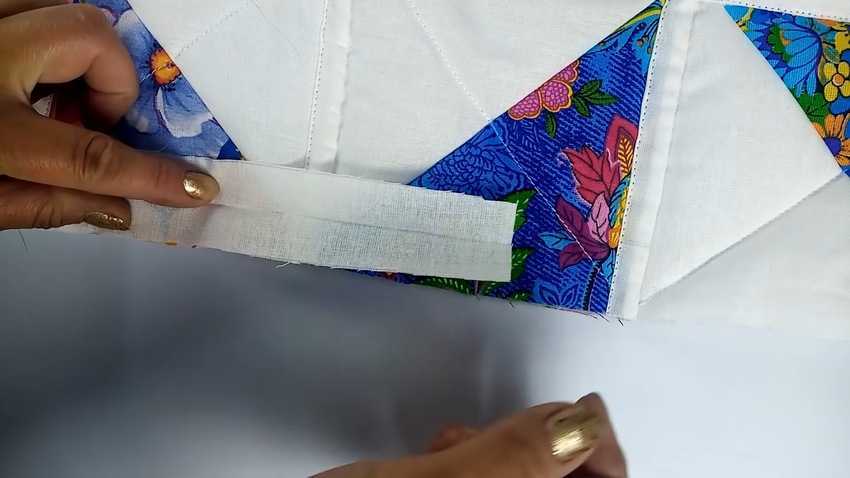 - Отметьте и отрежьте угол, отступая от набивной части 1 см (на шов). Этот отступ отогните на лоскутный верх, а подкладочный срез подогните тоже на 1 см и закалывайте так.