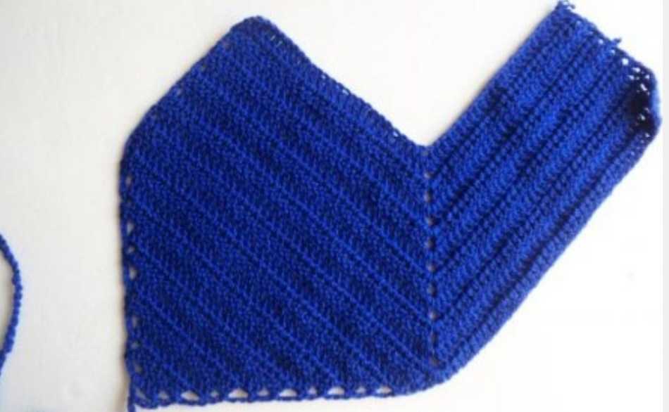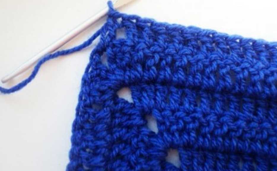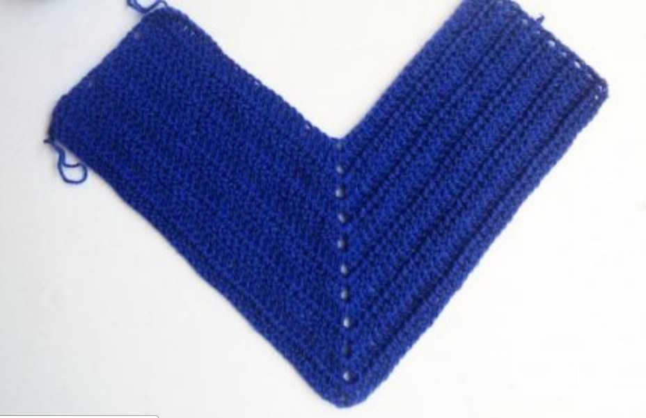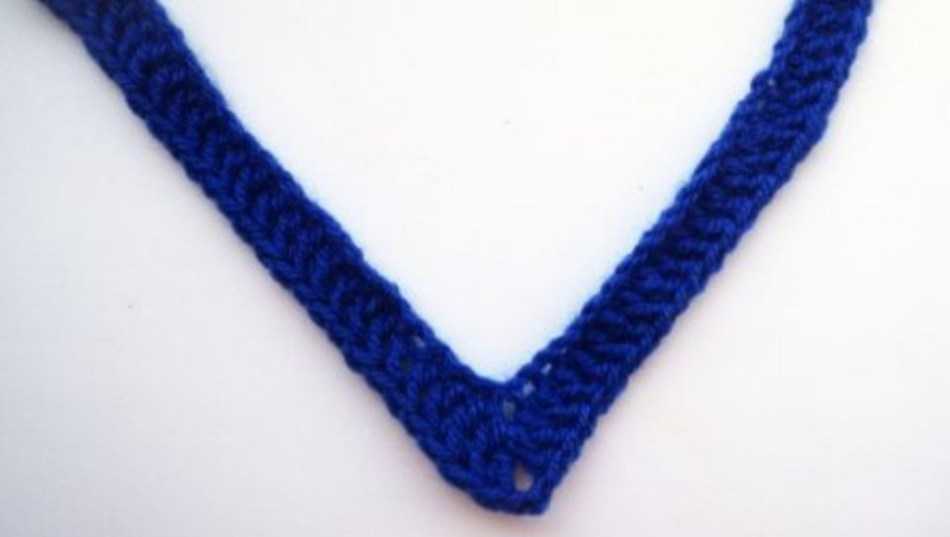 Следующей петле предстоит стать средней, которая будет основой V-образного выреза. В нее мы свяжем два столбика с накидом, одну воздушную петлю и снова два столбика с накидом. Затем в каждую из оставшихся 25 петелек провязываем по одному столбику с накидом. Видите уголок? Это и будет вырез.