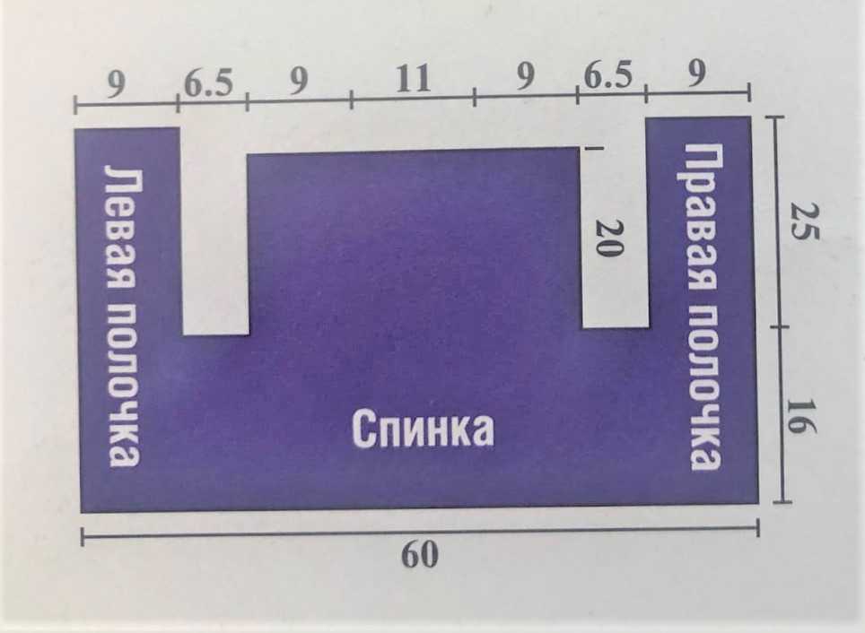 Спинка: крючком № 3 набрать цепочку из 64 в. п. (63 в. п. основы + 1 в. п. подъёма) и вязать 37 р. основным узором «тунисская вязка». Для оформления линии пройм в 38-м р. закрыть с обеих сторон 2 раза по 2 п., 3 раза по 1 п. В работе находится 50 п. Далее вязать 9 р. основным узором «тунисская вязка». Для оформления линии горловины в 17-м р. от линии проймы полотно разделить на две равные части. В 18-м р. от линии проймы оставить непровязанными 10 п., в 19-м ряду – 7 п. В работе 15 р. В 20-м ряду от начала пройм все петли закрыть в одном ряду.